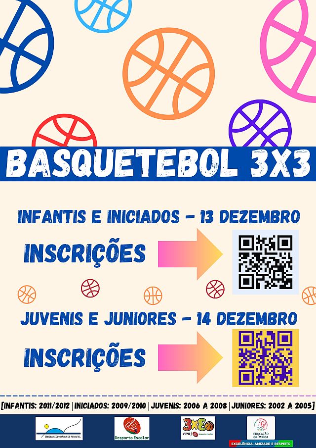 Estão abertas as inscrições para o Torneio de Basquetebol 3×3, a realizar nos dias 13 e 14 de dezembro. Mais informações junto dos professores de Educação Física.