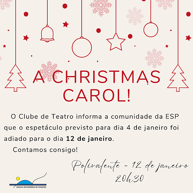 O Clube de Teatro da escola apresenta, no dia 12 de janeiro de 2024, pelas 20h30min, no polivalente, a peça “A Christmas Carol”, uma adaptação do conto de Charles Dickens.