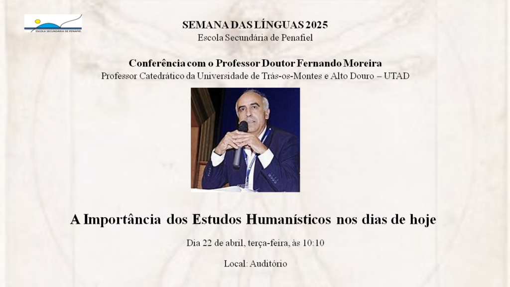 No próximo dia 22 de abril (terça-feira), pelas 10:00, a Escola Secundária de Penafiel vai receber o Professor Catedrático da UTAD, Fernando Alberto Torres Moreira, que irá proferir uma conferência dirigida a alunos de 12º ano do curso de Línguas e Humanidades, subordinada ao tema da importância dos Estudos Humanísticos na atualidade.