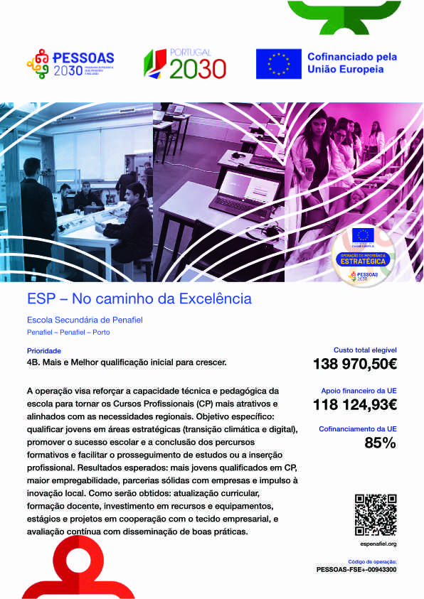 A operação visa reforçar a capacidade técnica e pedagógica da escola para tornar os Cursos Profissionais (CP) mais atrativos e alinhados com as necessidades regionais. Objetivo específico: qualificar jovens em áreas estratégicas (transição climática e digital), promover o sucesso escolar e a conclusão dos percursos formativos e facilitar o prosseguimento de estudos ou a inserção profissional. Resultados esperados: mais jovens qualificados em CP, maior empregabilidade, parcerias sólidas com empresas e impulso à inovação local. Como serão obtidos: atualização curricular, formação docente, investimento em recursos e equipamentos, estágios e projetos em cooperação com o tecido empresarial, e avaliação contínua com disseminação de boas práticas.