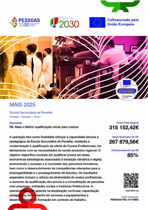 A operação tem como finalidade reforçar a capacidade técnica e pedagógica da Escola Secundária de Penafiel, mediante a modernização e qualificação da oferta de Cursos Profissionais, em alinhamento com as necessidades do tecido produtivo regional. O objetivo específico consiste em qualificar jovens em áreas económicas estratégicas associadas à transição climática e digital, promovendo o sucesso e a conclusão dos percursos formativos, bem como o desenvolvimento de competências relevantes para a empregabilidade e o prosseguimento de estudos. Os resultados esperados incluem o reforço da atratividade do ensino profissional, o aumento da qualificação dos alunos e a consolidação de parcerias com empresas, entidades sociais e Institutos Politécnicos. A operacionalização assenta na atualização curricular, capacitação pedagógica, investimento em recursos e equipamentos e desenvolvimento de formação em contexto de trabalho.